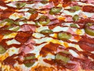 sos, ser, pieczarki, kiełbasa peperoni, cebula, oliwki zielone -